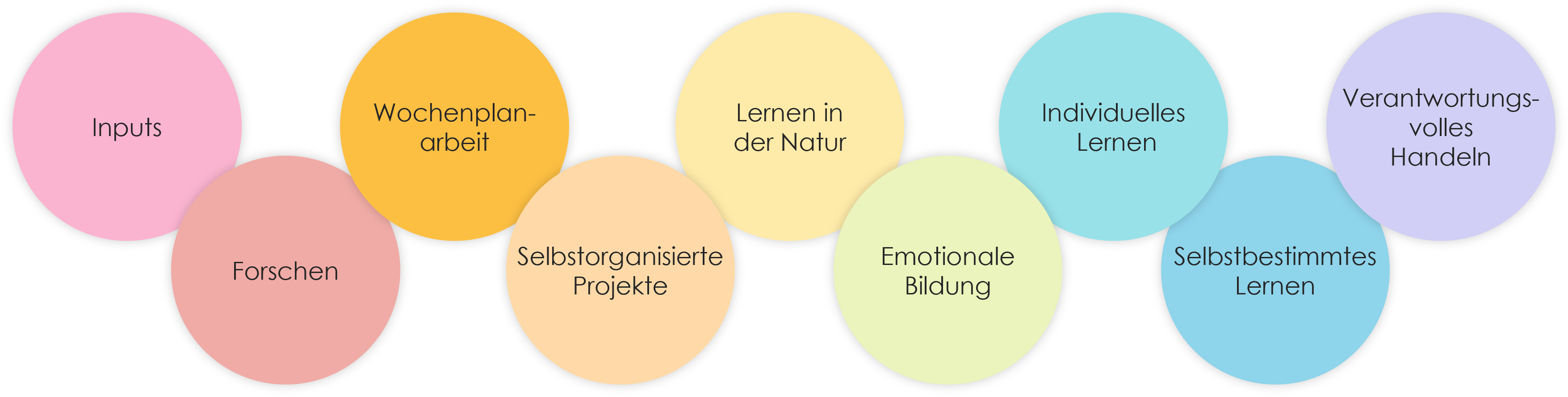Freiheit & Eigenverantwortung: Die Kinder haben die Freiheit, ihre Lernwege selbst zu wählen. Lernbegleiter und Lernbegleiterinnen fungieren als Mentoren, begleiten und unterstützen die Schüler und Schülerinnen auf ihren Lernwegen. Die Bildungsplankompetenzen sind verbindlich, die Lernwege jedoch individuell.